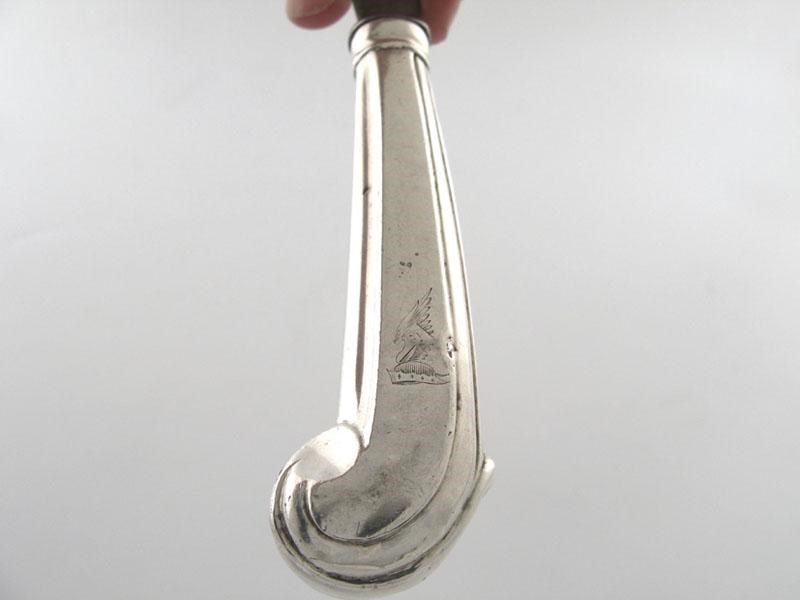 A set of twelve 18th century silver handled table knives, steel blades, the handles crested, apparently unmarked, length 26.5cm. (12)