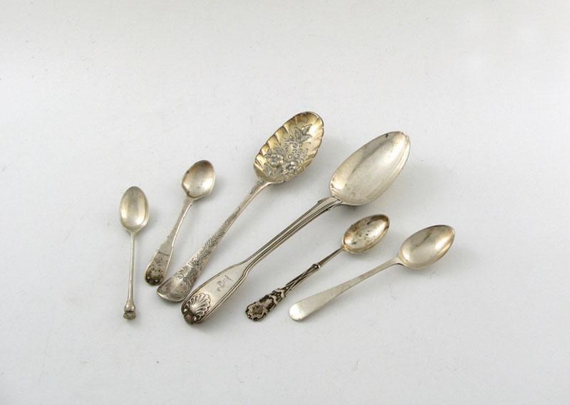 A mixed lot of silver flatware, various patterns, dates and makers, comprising: three table spoons, two table spoons with later berry decoration, four egg spoons, a set of ten tea spoons, and thirteen further spoons, approx. weight 28oz. (qty)