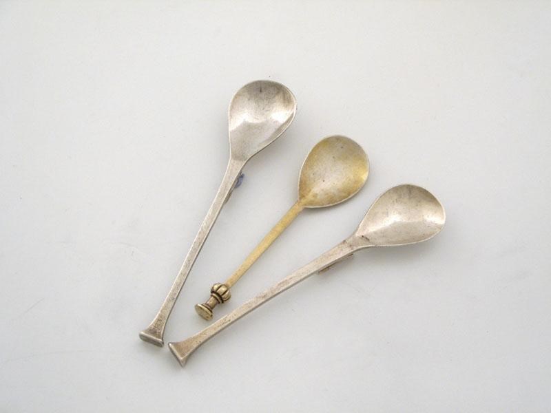 A pair of modern silver Arts and Crafts jam spoons, fig shaped bowls, faceted stems with hooks, with rectangular seal tops, by George Hart for The Guild of Handicraft, London 1973, plus a silver-gilt seal top spoon, by George Hart for The Guild of Handicraft, London 1998, approx. total weight 5oz. (3)