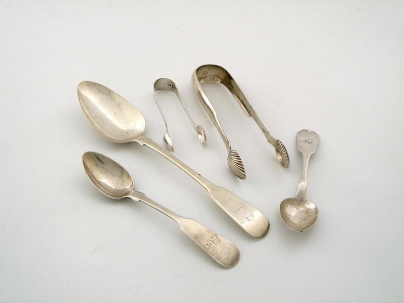 North American interest: Fiddle pattern dessertspoon, sugar tongs, and two teaspoons, one by Baily & Co, c.1850, and a pair of bright-cut sugar tongs, mixed maker's and dates. (4).