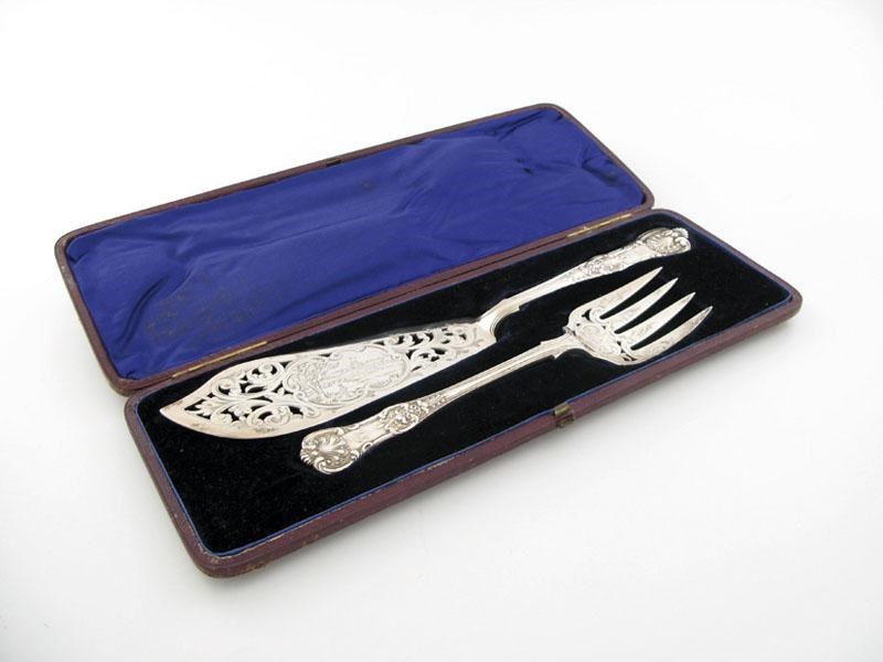 A pair of Victorian silver Queen's pattern fish servers, the blades pierced and engraved with foliate scroll decoration, and engraved with a fisherman on a river bank with a castle behind, monogrammed, approx. weight 10oz. in a fitted case.