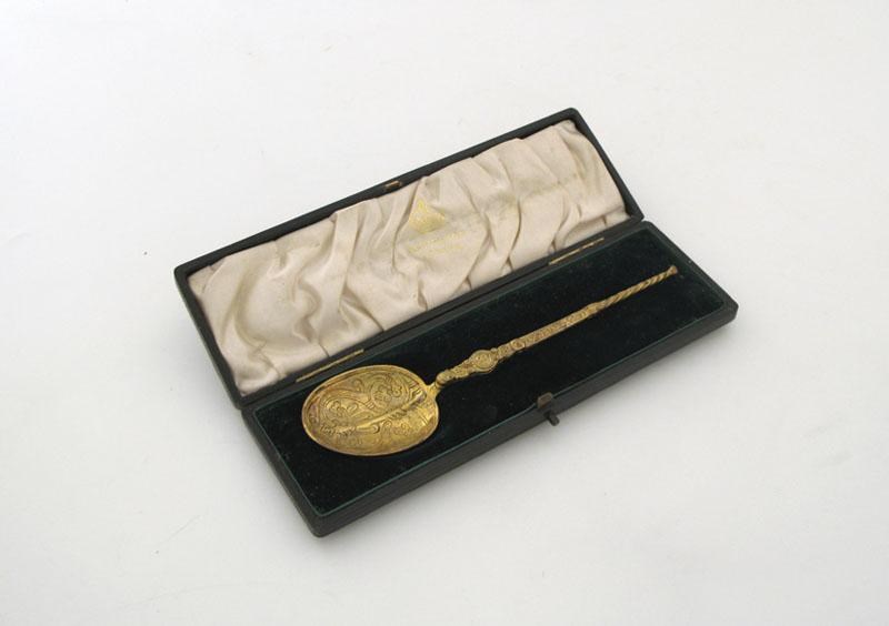An Edwardian silver-gilt anointing spoon, with chased decoration, by Elkington and Co., London 1904, in a fitted case, length 18.5cm.