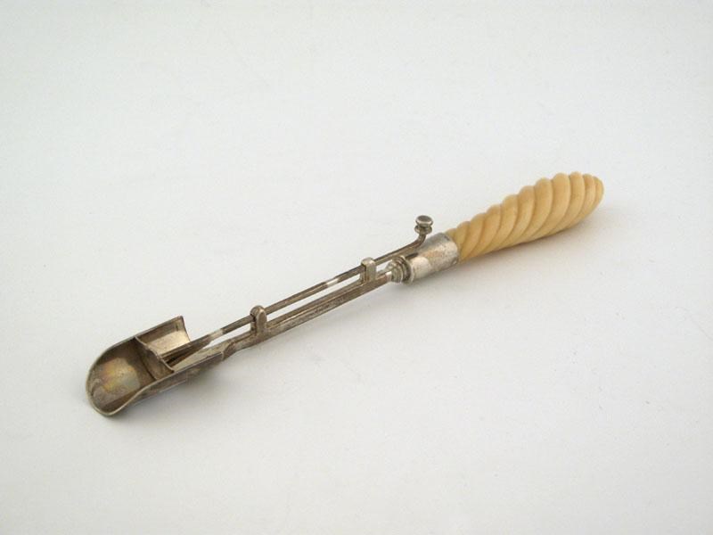 A modern stilton scoop, with an ivory wrythen handle and a pusher mechanism, makers mark 'BS', Birmingham 1986, 27.5cm long.