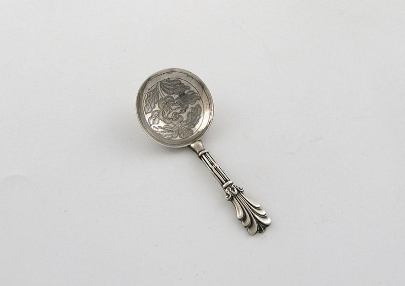 A William IV caddy spoon, with a circular bowl, engraved with a flower and leaves, scrolling stem, by George Unite, Birmingham, 1834.