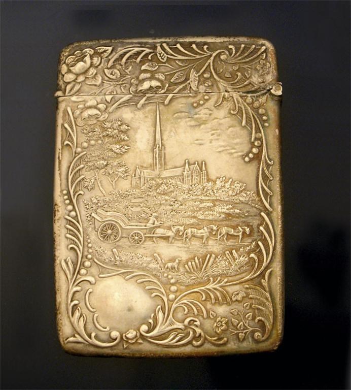An Edwardian card case, stamped on each side with a romantic interpretation of Salisbury Cathedral from the meadows, flanked by floral scrolls, by J.Gloster, Birmingham 1906, 9.7cm high, 2oz.