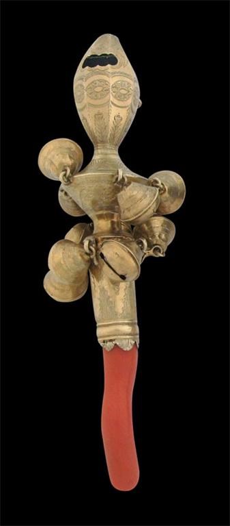 A George III silvergilt child's rattle, bright engraved with a vase shaped centre section, whistle terminal and coral teether, by Mary Ann Croswell, London 1810, 15.5cm long.