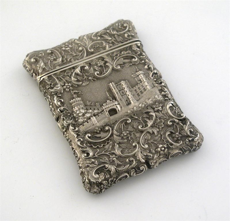 A Victorian embossed 'castletop' card case, double sided, with a view of Windsor Castle, on one side and Abbotsford on the other, flanked by stamped, floral scrollwork, by Joseph Willmore, Birmingham 1841, 10cm high, 2.75oz.