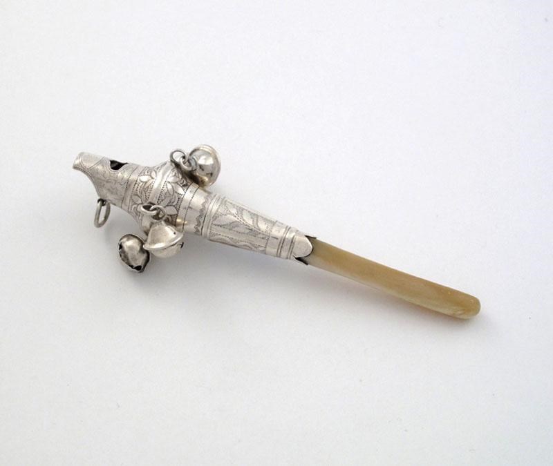 A George III engraved rattle, with four bells dependant, a whistle terminal and a mother-of-pearl teether, initialled by Lawrence & Co, Birmingham 1814, 4.8in (12.4cm) long.