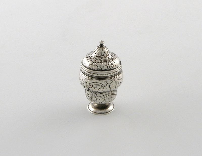 An 18th century silver nutmeg crater, of baluster form, chased scroll decoration, the screw off cover opens to reveal the grater, on a raised circular foot, by Samuel Meriton, circa 1770, height 4.8cm.