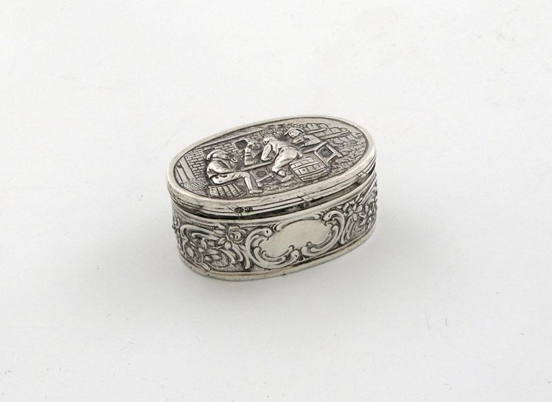 A modern continental, oval, snuff box, foliate decoration around the body, reeded border, embossed on the hinged cover with a tavern scene, import marks for Arthur Graf, London 1912, 5.8cm long, approx. weight 2oz.