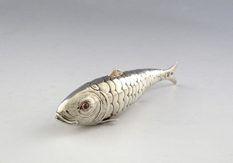 A late-Victorian silver reticulated fish spice box, the hinged head set with red glass eyes, with import marks for London 1899, importer's mark of John Smith, length 16cm., approx. weight 4oz.