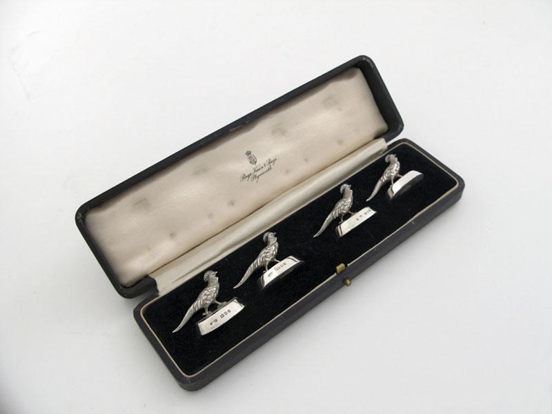 A set of four novelty silver menu card holders, modelled as standing pheasants, on oval bases, by S. Mordan and Co., London 1925, in a fitted case, height 2.8cm.
