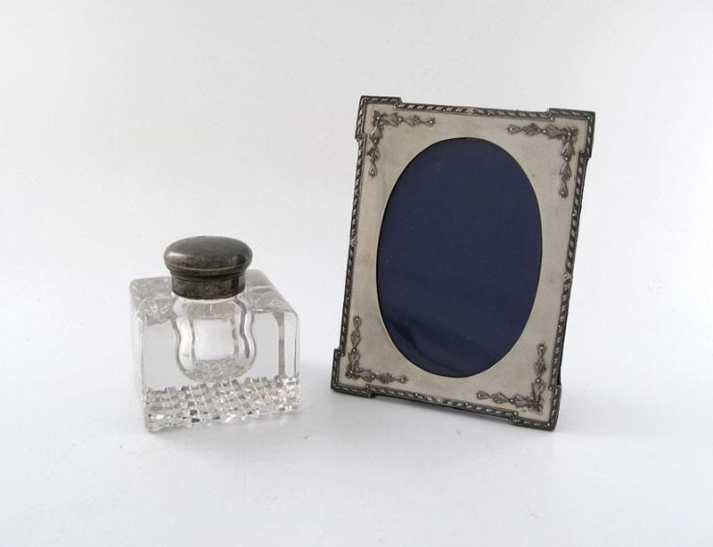 A modern mounted ink well, with a square body and cut-glass base, maker's mark worn, London, 1908, together with a photograph frame, applied floral decoration, with an oval window, by William Comyns & Son, London 1910. (2).