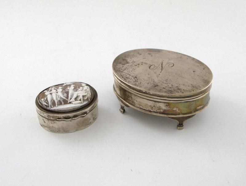 A Victorian oval box, with inset cameo on the cover of maidens dancing, scroll thumb piece, by T Hayes, 1895, together with a modern jewellery box, initialled on the cover 'N', velvet lining, on four feet, no maker's mark, Birmingham 1945. (2).