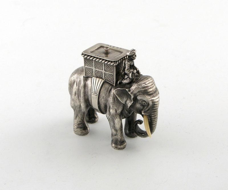 A Victorian novelty silver elephant table cigar lighter, the elephant in a standing position, mounted with a basket inscribed 'ALERT 1880', and with a figure in Indian dress, ivory tusks, (one missing,) by James Barclay Hennell, London 1879, length 8cm., height 7.2cm., approx. weight 5oz.
