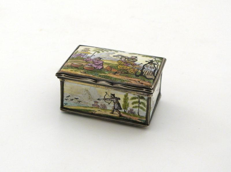 An 18th century French silver and enamel mounted snuff box, with six enamel on copper panels painted in the Chinoiserie style, the cover depicting musicians with a pagoda and rocky mountains in the background, with reeded silver cage work mounts, control marks to rim, length 6.9cm.