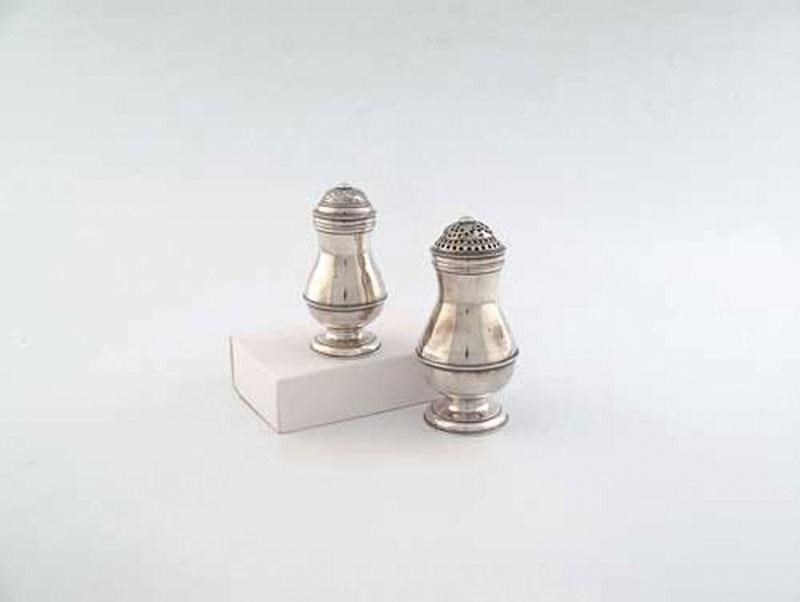 A George II large bun top caster, with a baluster body and moulded grille together with a smaller 'blind' mustard to match,both by John Newton, London 1730, the latter 10cm high, 6oz. (2)