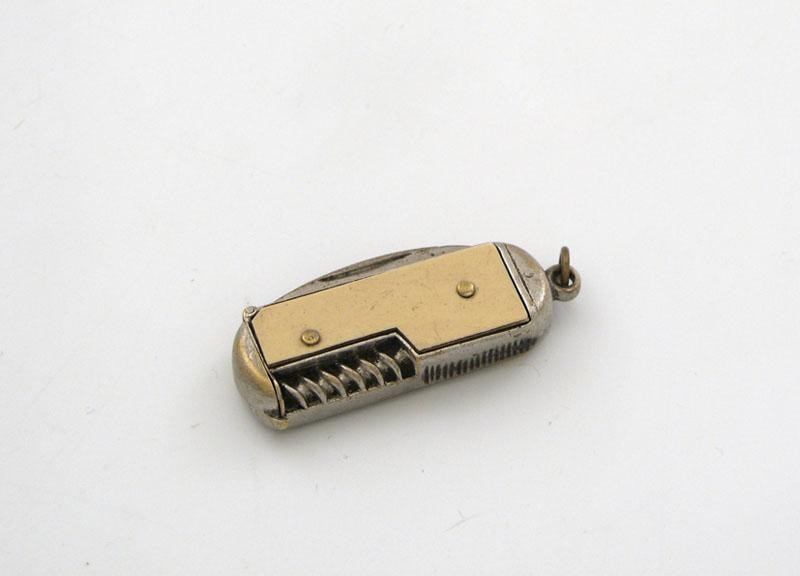 A novelty base metal vesta case, modelled as a penknife with a corkscrew, hinged cover length 5cm.