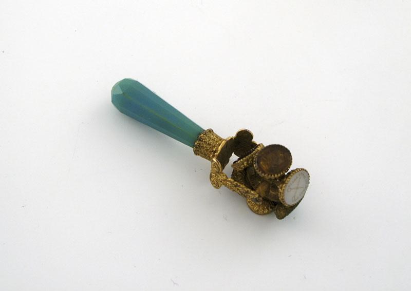 A 19th century French gilt-metal hand seal wheel, tapering faceted coloured glass handle, the wheel with six engraved matrix, the gilt metal mounts with foliate scroll decoration, length 9.2cm.
