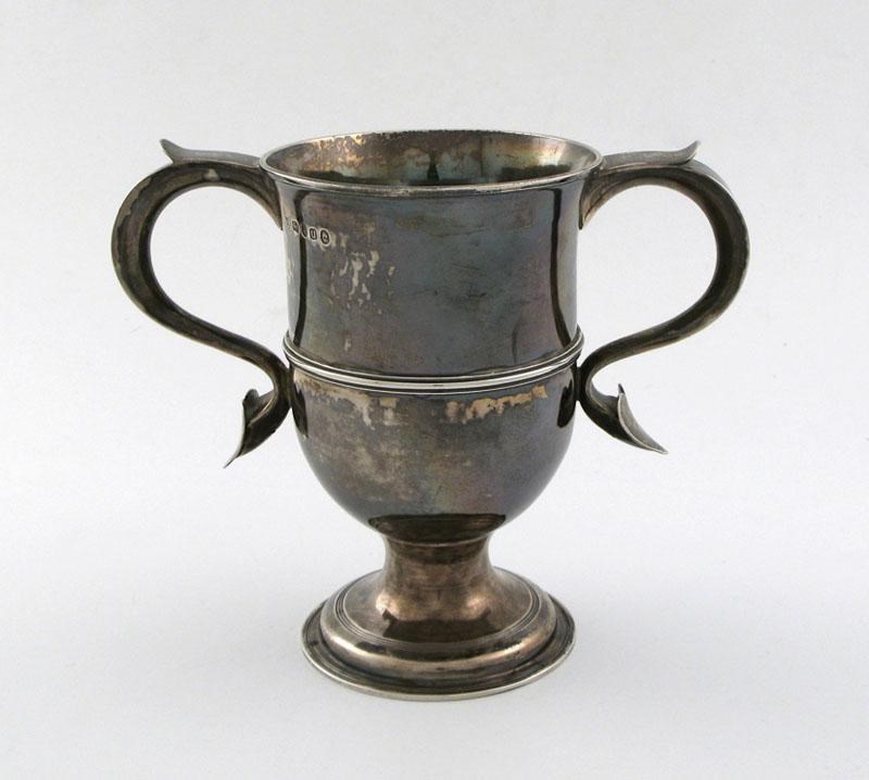 A George III two handled cup, reeded girdle and spreading pedestal foot, initialled 'B' over 'OS', on one handle. by Samuel Godbehere & Edward Wigon, London 1795, 15cm high, 11oz.
