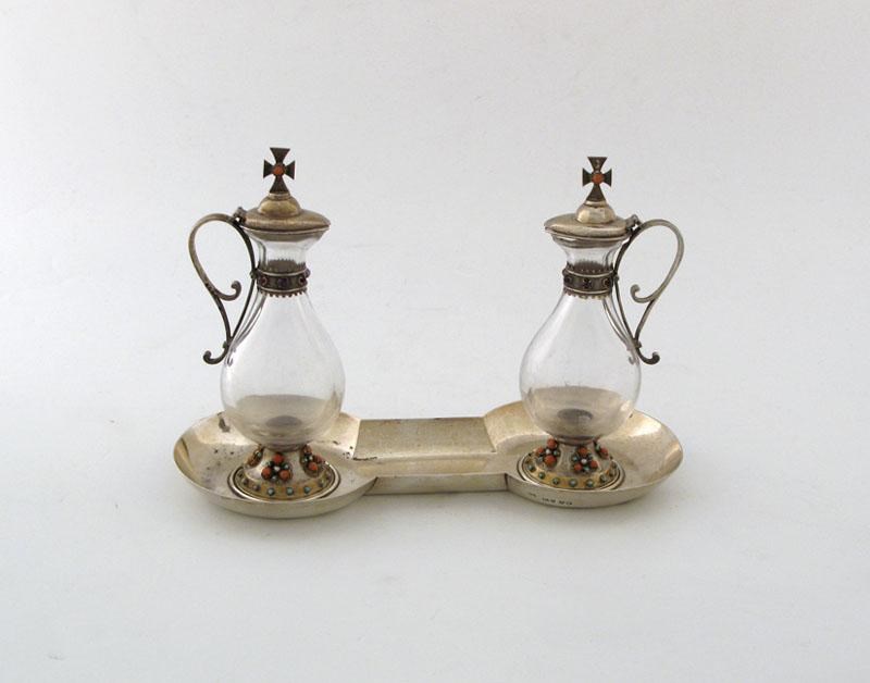A pair of Victorian silver mounted altar cruets on a stand, baluster form, the silver mounts set with coral, turquoise, pearls and garnets, domed hinged covers mounted with a cross, the whole on a raised oval foot, the stand of shaped plain oval form, by John Figg, London 1878, height 15.5cm., length 24.2cm.