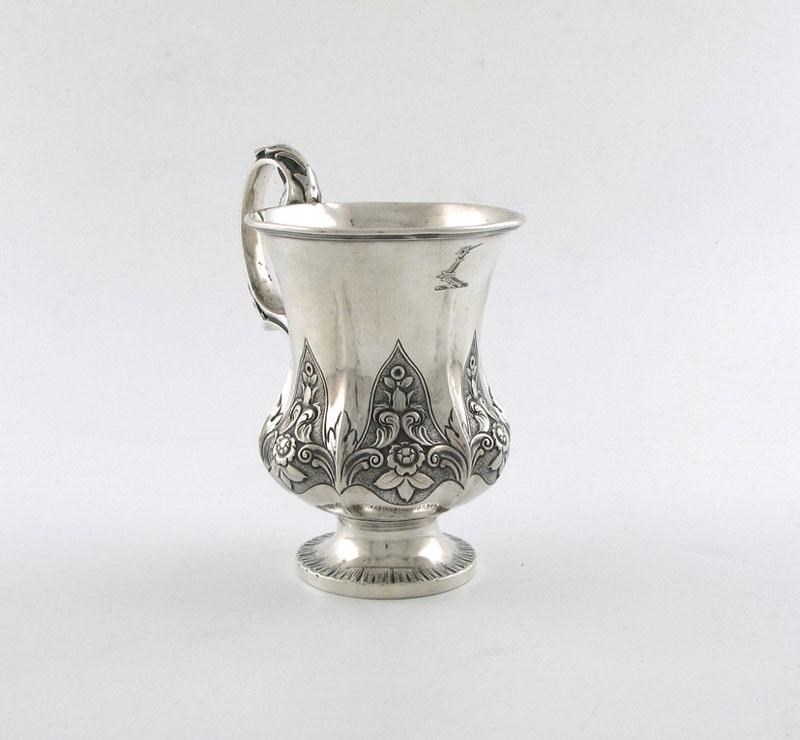 An early-Victorian IV Irish silver mug, of campana form. leaf capped scroll handle, embossed foliate decoration on a matted background, the whole on a raised circular foot, engraved with crest, by James Fray, Dublin 1837, height 13cm., approx. weight 8oz.