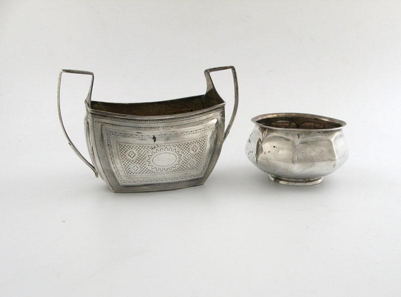 A George III two-handled sugar basin, boat shaped, with engraved decoration, gilt interior, maker's mark partially worn, possibly by Duncan Urquhart & Naphtali Hart, London 1811, 17.6cm long, and a modern octagonal sugar basin, by Goldsmiths' & Silversmiths Co Ltd, London 1911, approx. 13.5oz in total. (2).