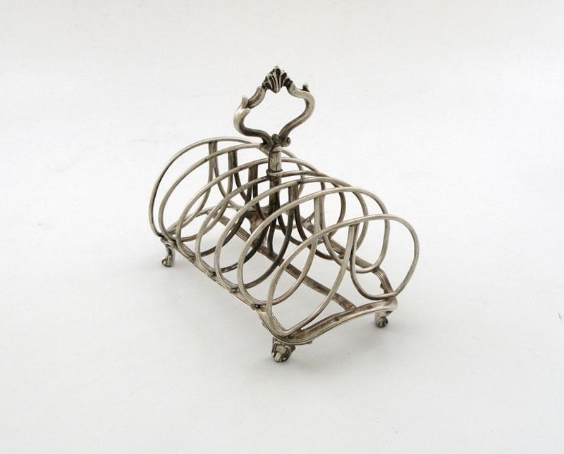An early Victorian silver seven bar toast rack, with a central shell capped scroll carrying handle, on a rounded rectangular base, on four bracket feet, by J. Dixon and Sons, Sheffield 1842, length 17.2cm.