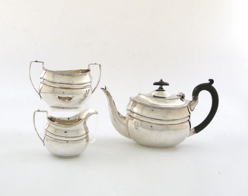 A three-piece silver bachelor's tea set, of oval bellied form, scroll handles, domed hinged covers, by S. Blanckensee and Co., Birmingham 1919, approx. weight 20oz. (3)