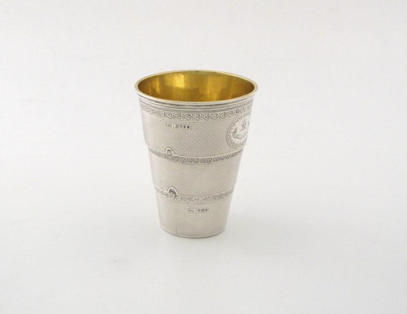 A Victorian silver collapsible beaker, in three sections, of tapering circular form, engine turned decoration, stylised borders, each side with two rivets, engraved with a crest, gilded interior, height 9.8cm., approx. weight 4.5oz.
