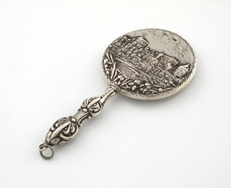 A modern miniature hand mirror, circular, with an embossed scene of Windsor castle on the back, shaped handle, suspension loop, by Chrisford & Norris, Birmingham 1904, 11cm long.