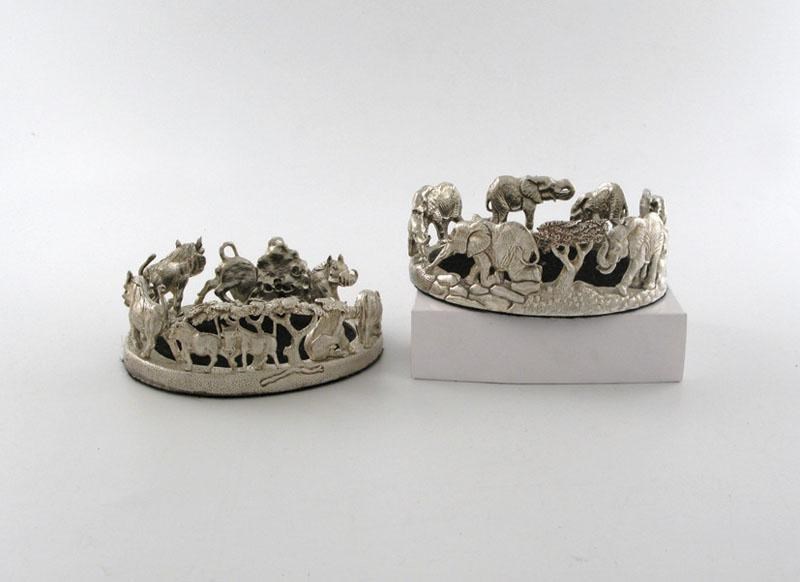 By Patrick Mavros: Two Zimbabwean silver modern bottle coasters, one formed from a ring of elephants, the other a ring of warthogs. (2).
