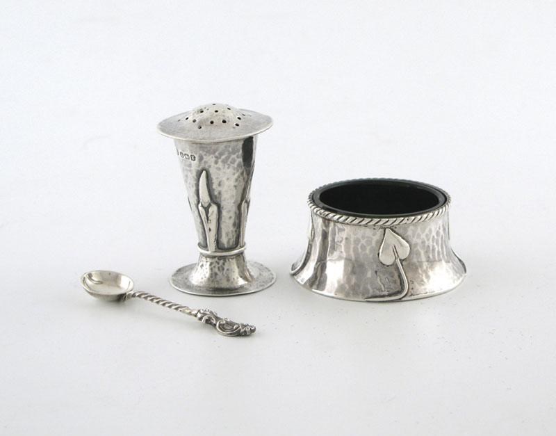 An Arts and Crafts silver salt cellar and pepper pot, of circular form, spot hammered decoration, with applied motifs, the salt cellar with a green glass liner, by A.E. Jones, Birmingham 1906 and 1910, height of pepper 5.7cm., plus a silver spoon. (3)