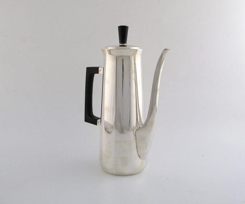 By A.E.Jones, a modern silver coffee pot, of tapering circular form, the bayonet fitting cover with a tapering finial, angular scroll handle, Birmingham 1968, height 29cm., approx. weight 32oz.