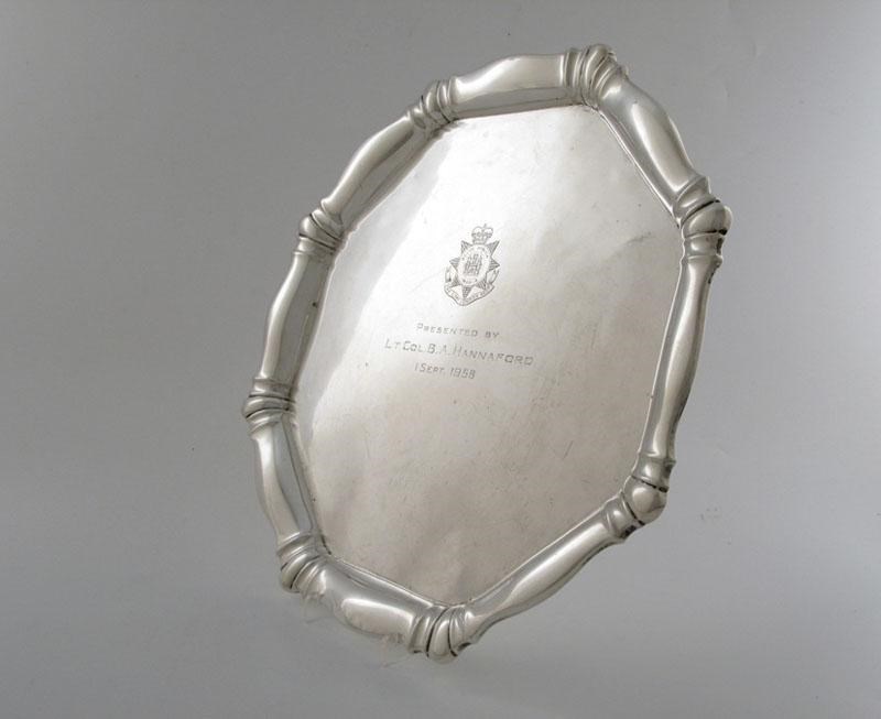 A presentation silver salver, shaped circular form, moulded border, engraved with the badge of The 23rd London Regt., and inscribed ' Lt. Col.B.A.Hannaford 1 Sept 1958', maker's mark worn, Birmingham 1926, diameter 31.6cm., approx. weight 25oz.