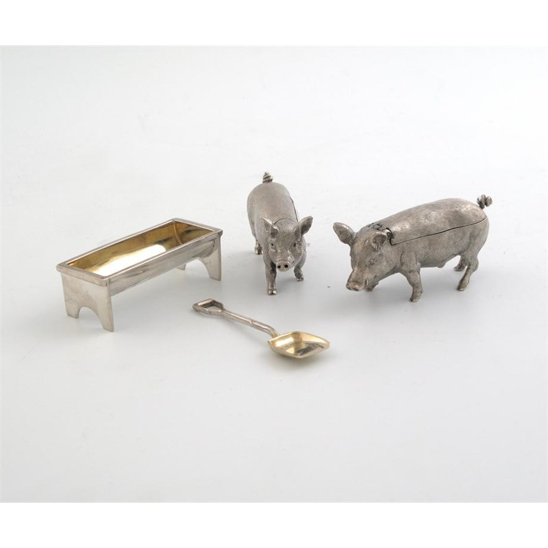 A modern cast, novelty pig condiment set comprising: a boar mustard pot with hinged back, and spoon (protruding to form his tail) a sow pepperette and a trough salt with shovel spoon by C. F. Hancocks & Co, London 1990, the boar 3.2in (8cm) long, 7oz (5)