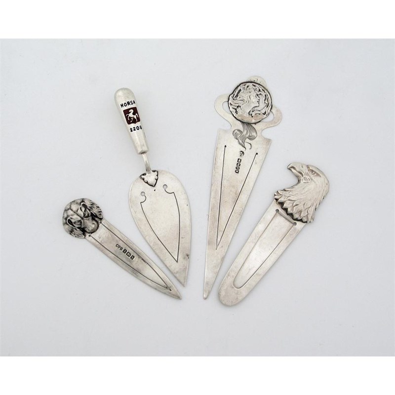 A 20th century American bookmark, with an eagles head terminal by Tiffany & Co, c.1920, an art nouveau bookmark with a female mask on the terminal, English import mark for 1901, an enamelled trowel bookmark 'Horda 2208', Birmingham 1922 and another with a spaniel mask terminal, Birmingham 1908. (4)