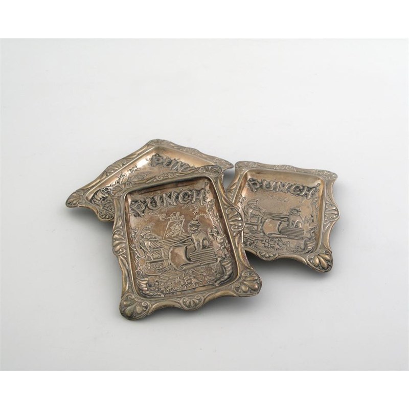 A set of three late Victorian novelty pin trays stamped in relief with the cover of "PUNCH"...