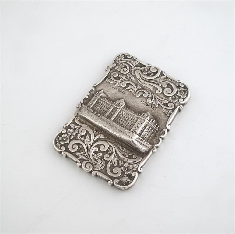 A rare Victorian embossed 'castletop' card case, with an atypical view of Buckingham Palace, in high relief, flanked by chased foliate scrolls, by Alfred Taylor, Birmingham 1854, 4in (10cm) high, 2.25oz.
