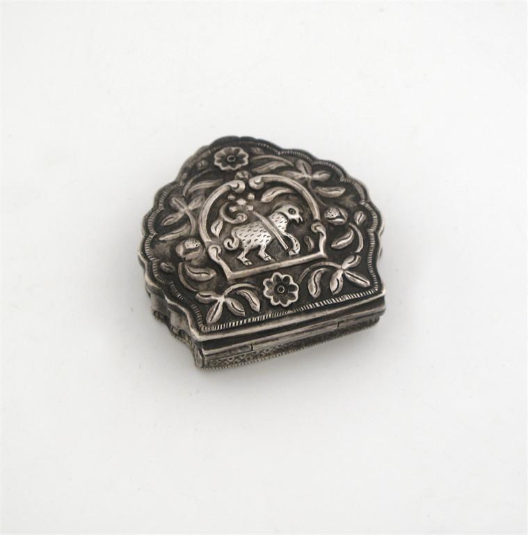 A small embossed box, in the form of a stylised scallop shell, with the Agnus Dei and flowers on the cover and a chased flower on the base, traces of gilding, unmakred, probably a pyx, late 18th century unascibed, 2.25in (5.8cm) wide, 1.3oz.