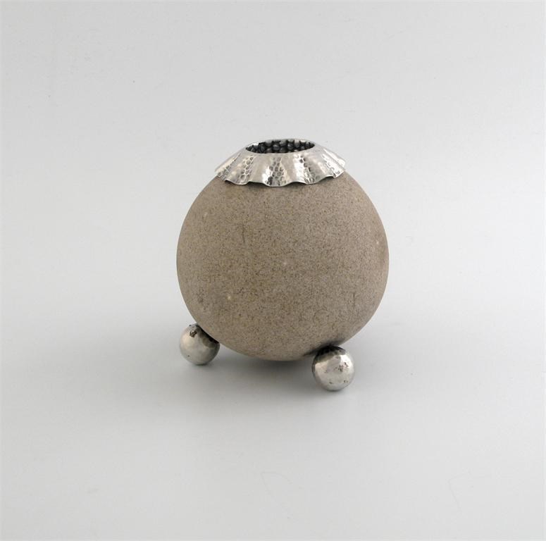 A late Victorian mounted stone match holder/striker, globular, on three ball feet with a hammered finish and a frilly upper mount, by Harry Wright Atkin, London 1887, 4.75in (12cm) high.