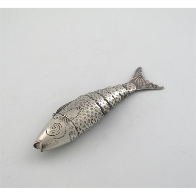 A George III engraved novelty vinaigrette, in the form of a reticulated fish, the hinged revealing a hinged grille, gilt interior, makers mark lost in the engraving, Birmingham 1818, 3in (7.6cm) long.