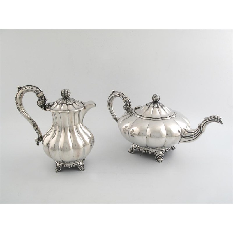 An early 20th century Canadian teapot and matching hot milk jug, melon fluted with scroll handles and fruit finials, by Birks. 54oz (2)