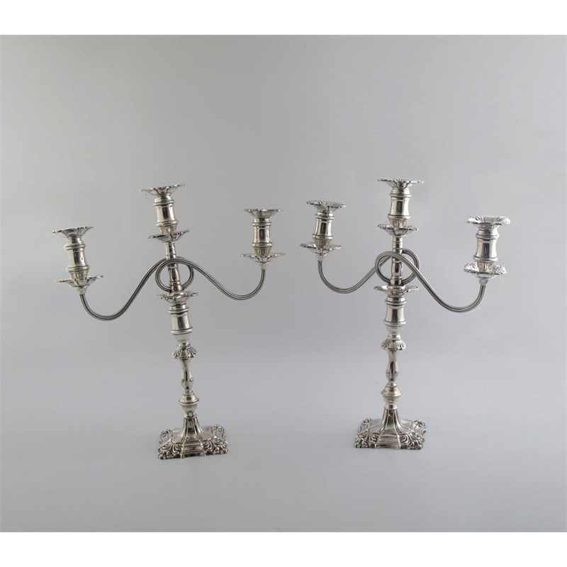 A pair of modern three-light candelabra with reeded branches, shaped square bases and shell decoration at the corners, 1(A/F) maker's mark "AT & SON" London 1957. 16in (41cm) high. 68oz.