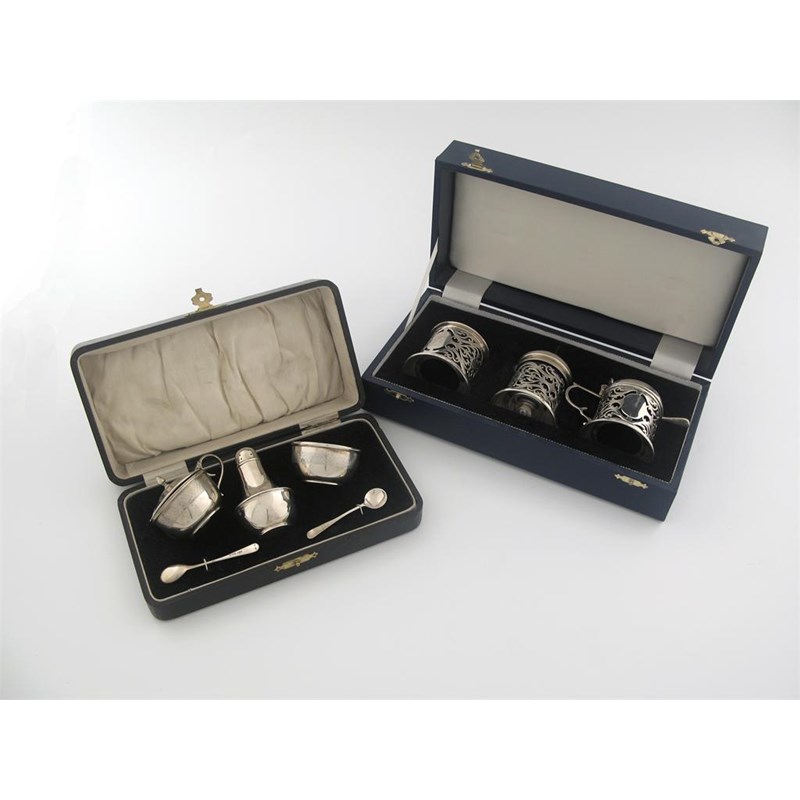 Two cased modern three piece condiment sets: one with engine-turned decoration and two spoons, the other with pierced decoration, blue glass liners and one spoon. (2)