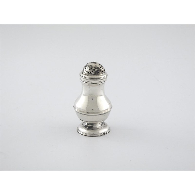 A George II bun top pepper, of baluster form on a domed foot, probably by Chalres Chesterman (I), London 1740 (date letter worn), 3.75in (9.5cm) high, 2oz.