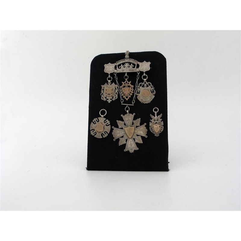Yorkshire, a fine and most unusual group of badges awarded for fundraising, for the Leeds W.P. Hospital, by Cemetery Tavern, 'For collectung £20 in one year', 1896, 1897, 1899, 1900, this 9ct gold, 1901, 1903, the badges of differing openwork designs, the silver each with 'gold' centres, and four of the six suspended from a wide crown brooch, Birmingham Hallmarks.