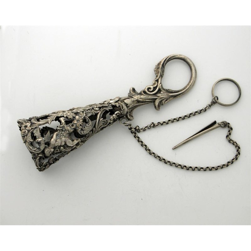 A Victorian plated posy holder, small handle, pieced with putti amongst floral scrolls, unmarked c.1860 5.5in. (14cm) long.
