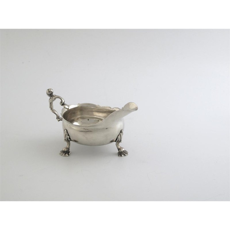 A George II cream boat with fret edge, the double scroll handle mounted with a female head, on three scallop feet, by Robert Innes, London 1743, 5.5in (14cm) overall length, 4.7oz