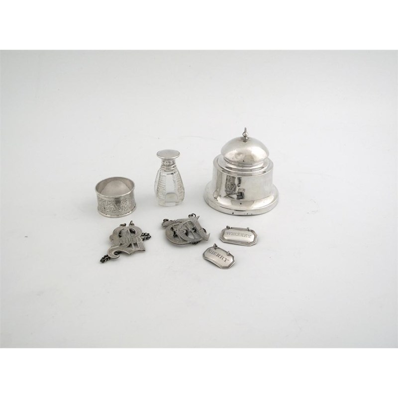 An inkwell, a napkin ring, a mounted bottle and four plated wine labels.